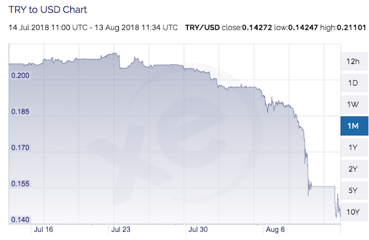 The latest trigger was Donald Trump’s announcement that he would double import tariffs on Turkish steel and aluminium. But the lira has been falling consistently over the past year as markets fear for the president’s increasing control over the economy.